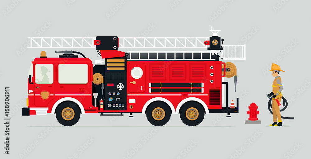 Fotografie Fire trucks with firefighters and fire fighting equipment.