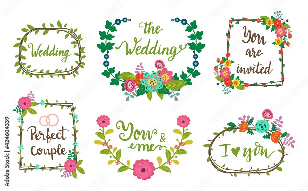 Fotografie Floral vintage lettering for wedding card set, vector illustration