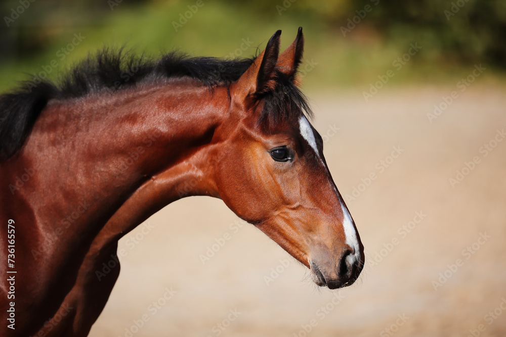 Fotografie Foal horse brown in the sunshine on the riding arena.