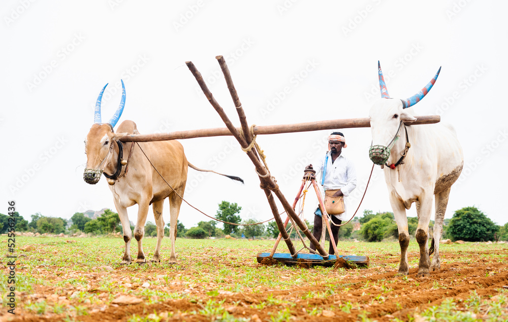 Obraz na plátně Focus on farmer, Indian farmer ploughing with cattle at farmland during monsoon season - concept of rural agriculture,farming and daily wagers