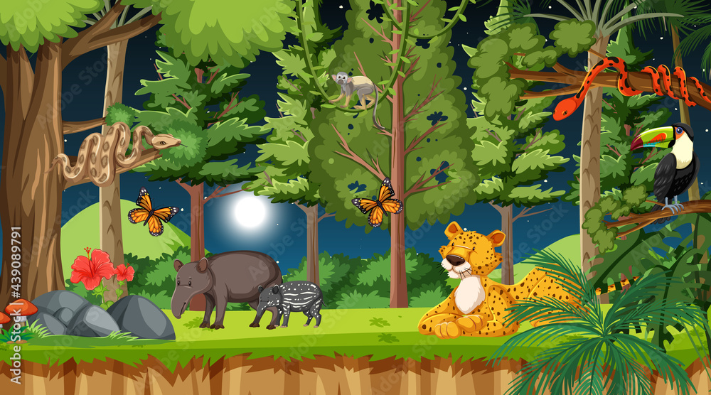 Fotografie Forest at night scene with different wild animals