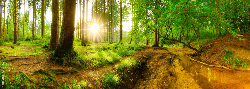 Fotografie Forest panorama with brook and bright sun shining through the trees