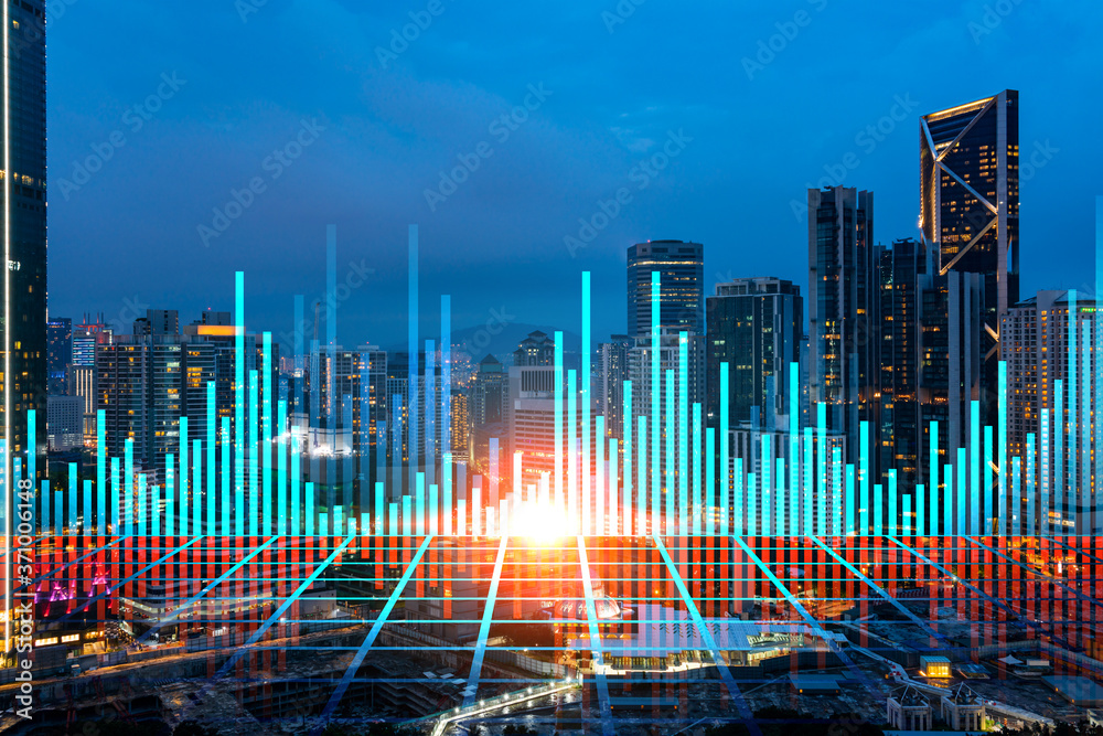 Fotografie FOREX graph hologram, aerial night panoramic cityscape of Kuala Lumpur