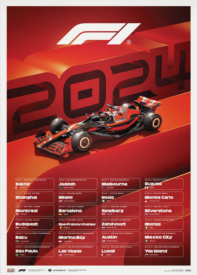 Každý fanoušek zná ten pocit, když sezóna Formule 1® končí. Po odmávnutí šachovnicovou vlajkou a vyhlášení vítěze přichází období sucha. Ale letos je čekání snazší – připravili jsme ve spolupráci s Formula 1® speciální plakát, který vás udrží v napětí až do startu roku 2024. Obsahuje kompletní kalendář všech plánovaných Velkých cen, které si můžete odškrtávat, jak budou probíhat.