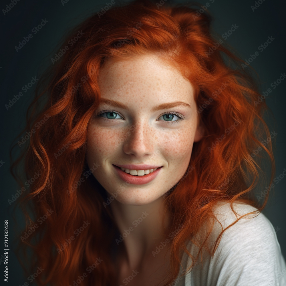 Fotografie fotografia con detalle de atractiva mujer peliroja sonriente, sobre fondo oscuro