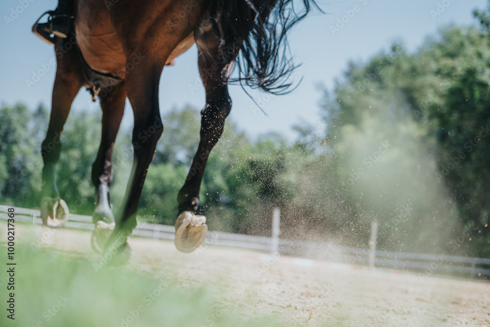 Fototapeta Dynamic close-up image of a horse's legs galloping on a sandy track, capturing motion and dust clouds under a clear sky