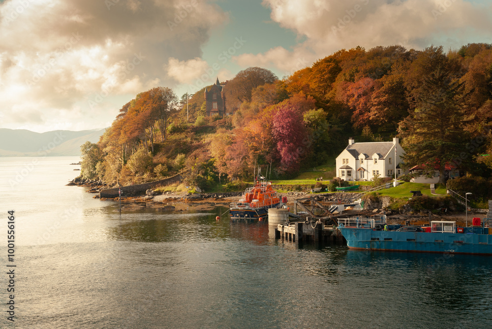 Fototapeta Petit port écossais sous une lumière d'automne de fin de journée, avec des arbre