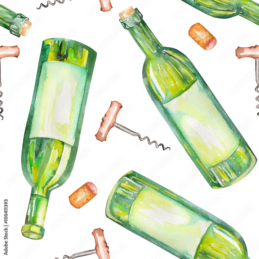Fototapeta A seamless pattern with the wine watercolor hand-drawn elements: wine bottles, wine corks and a corkscrew
