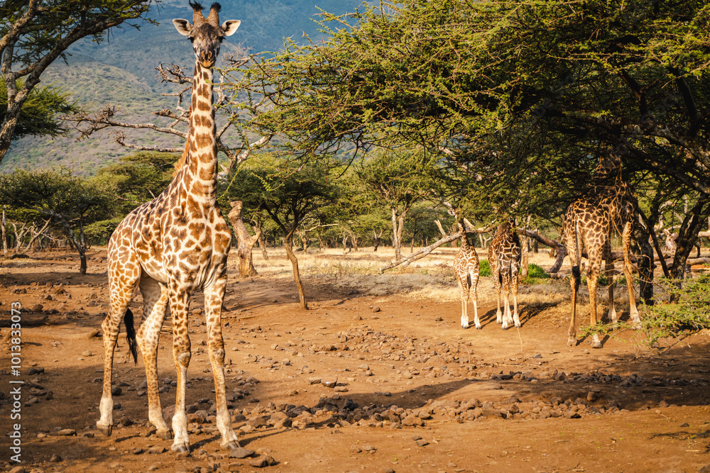 Fototapeta Group of Giraffes with One in the Foreground Gazing at the Camera – A Captivatin