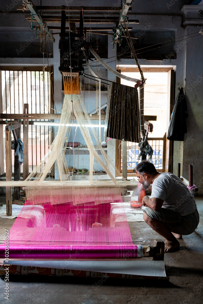 Fototapeta Indian man working alone in an artisan textile workshop