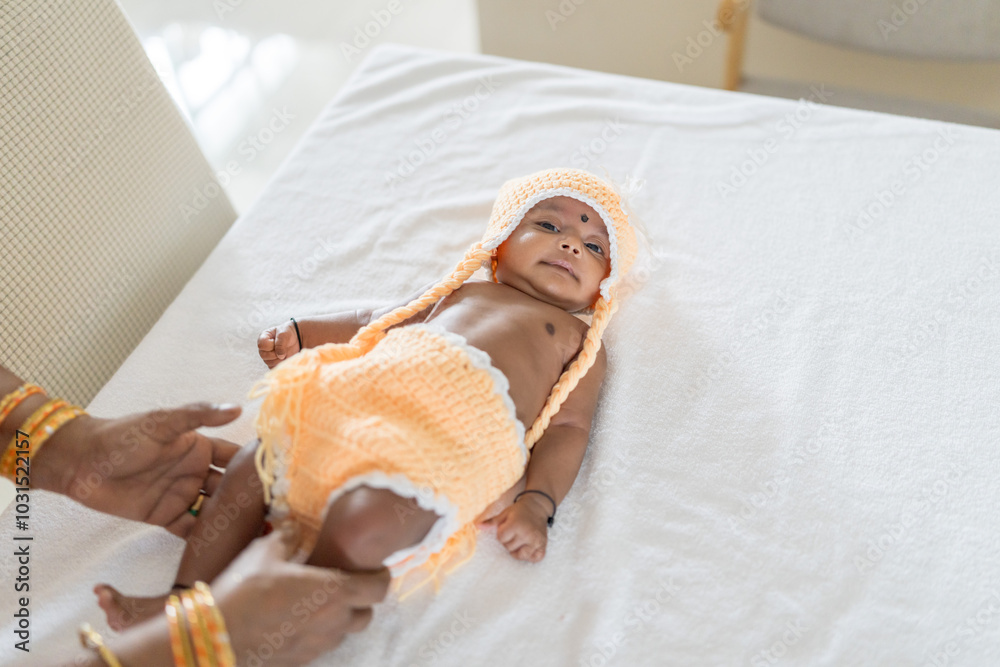 Fototapeta ndian family spending time together, wearing traditional and casual outfits with a baby, a young girl, and grandparents in a high-rise apartment in Kuala Lumpur, Malaysia