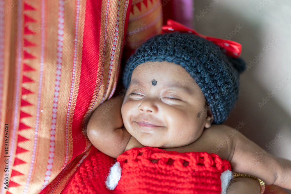 Fototapeta ndian family spending time together, wearing traditional and casual outfits with a baby, a young girl, and grandparents in a high-rise apartment in Kuala Lumpur, Malaysia