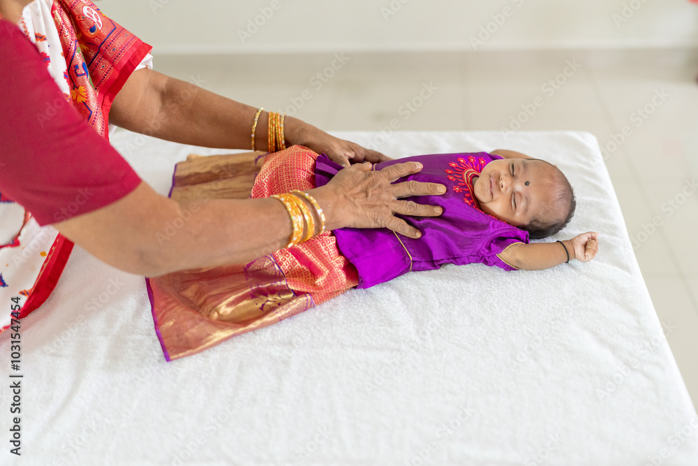 Fototapeta ndian family spending time together, wearing traditional and casual outfits with a baby, a young girl, and grandparents in a high-rise apartment in Kuala Lumpur, Malaysia