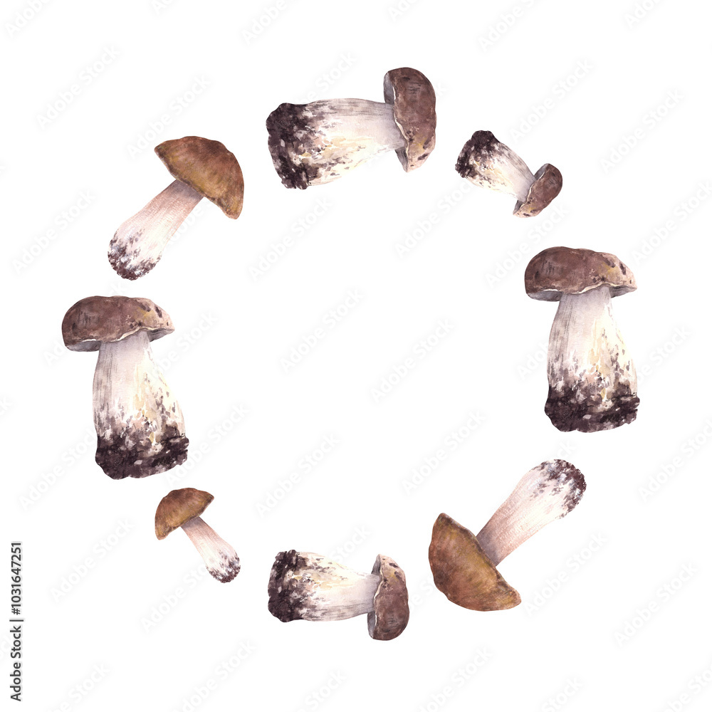 Fototapeta Edible sorts of mushrooms wreath Fungi forest circular frame Watercolor hand dra