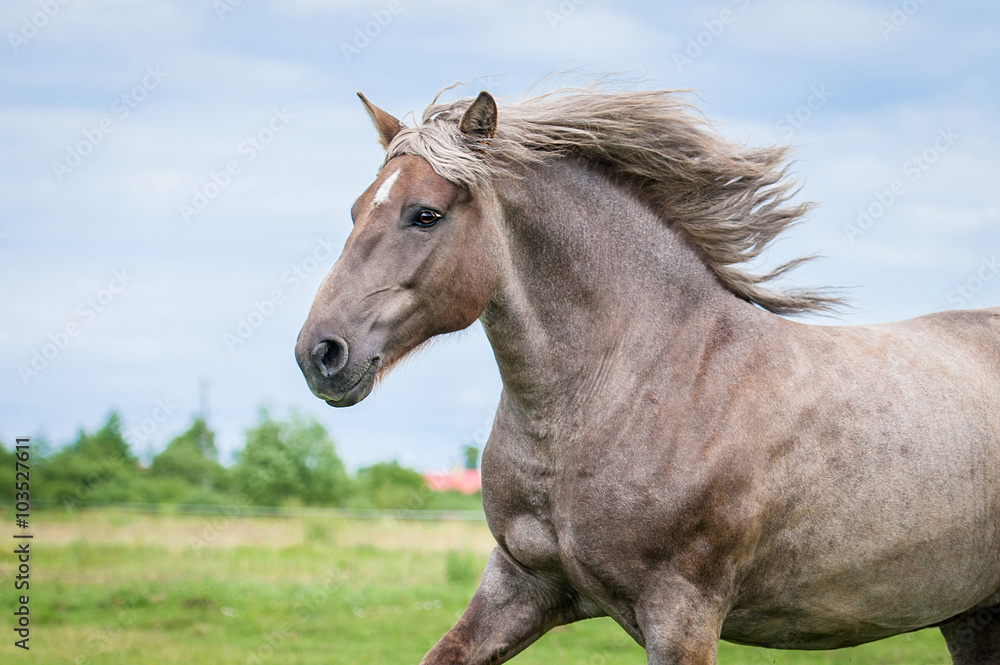 Portrait of beautiful running lithuanian heavy horse