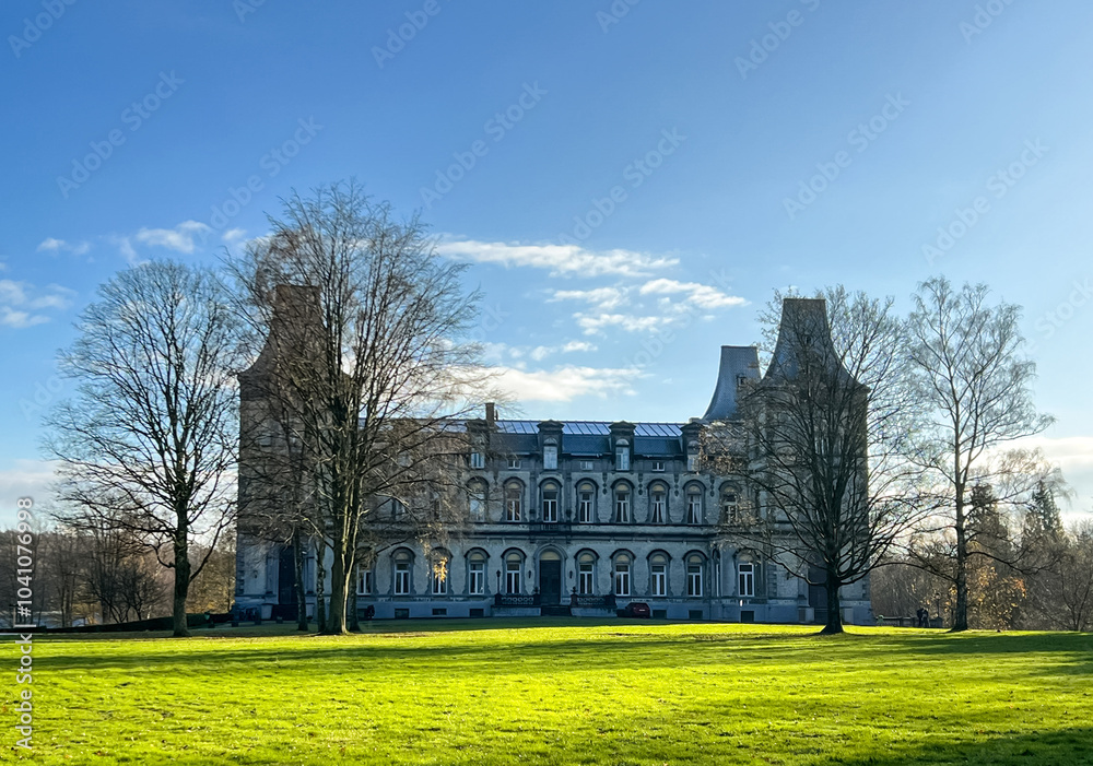 Fototapeta Historic mansion surrounded by lush green lawn and trees under a clear blue sky