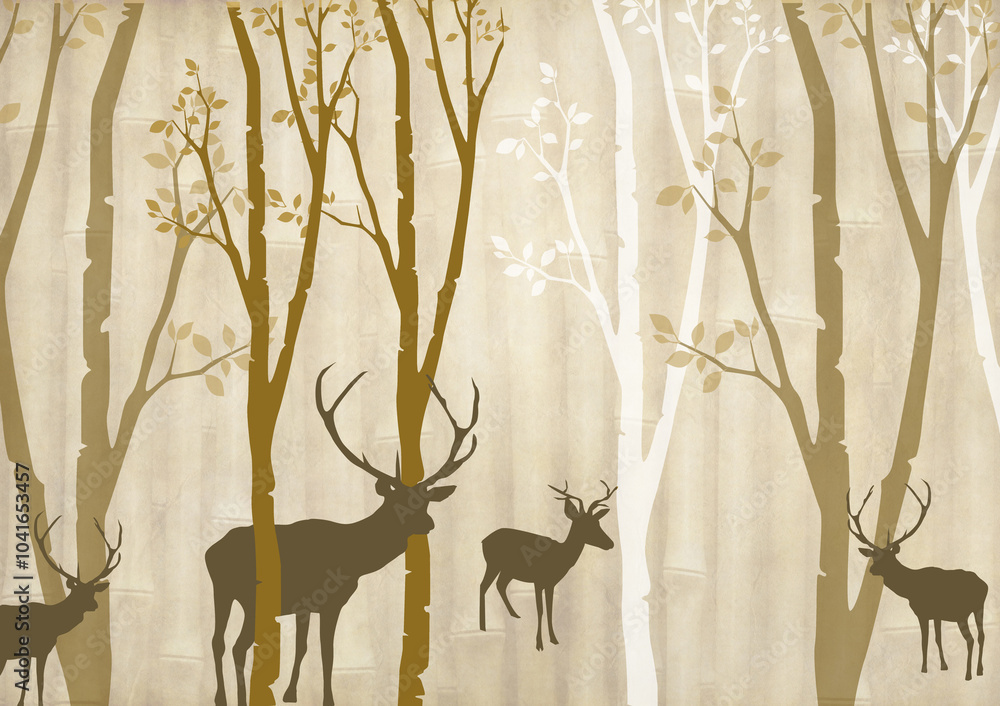 Fototapeta 3d illustration of deer silhouette on forest background , forest and animals wallpaper design illustration