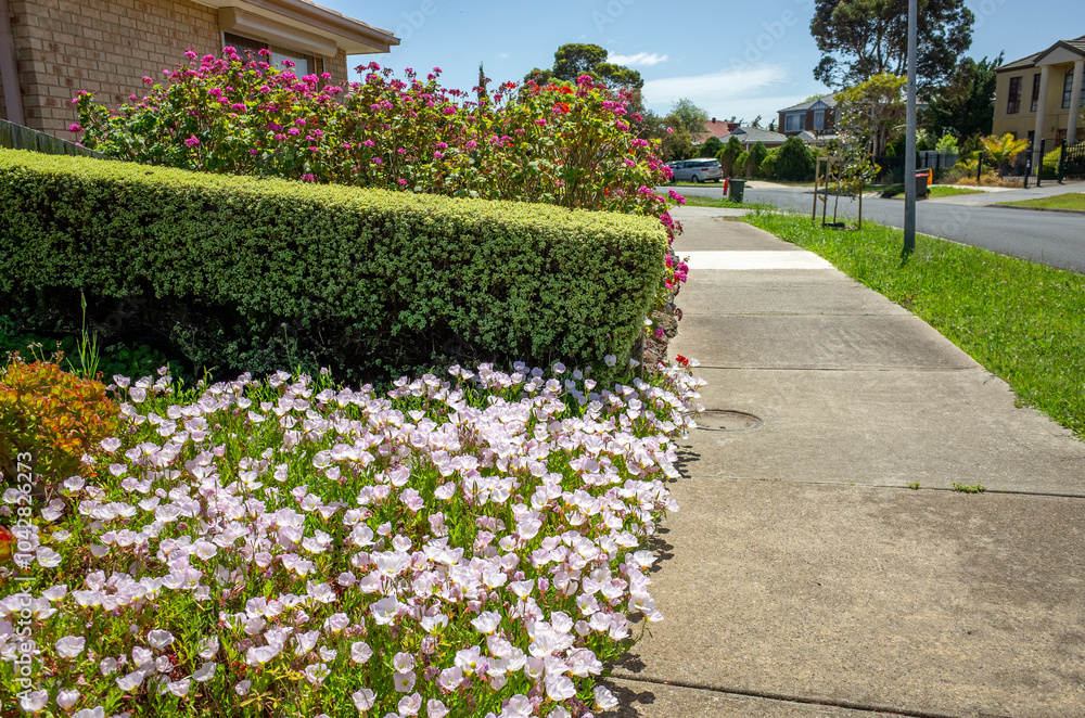 Fototapeta A well-manicured front yard garden of a suburban Australian home features a neat