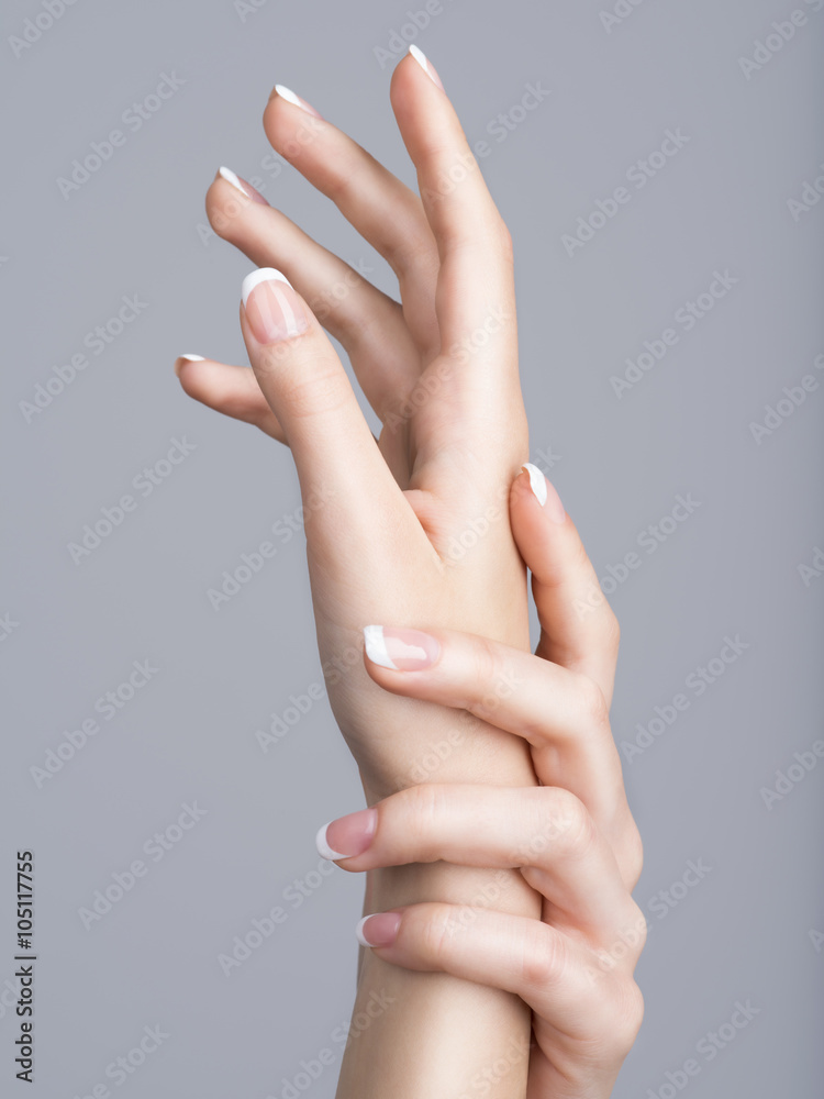 Fototapeta Beautiful female hands with french manicure on nails