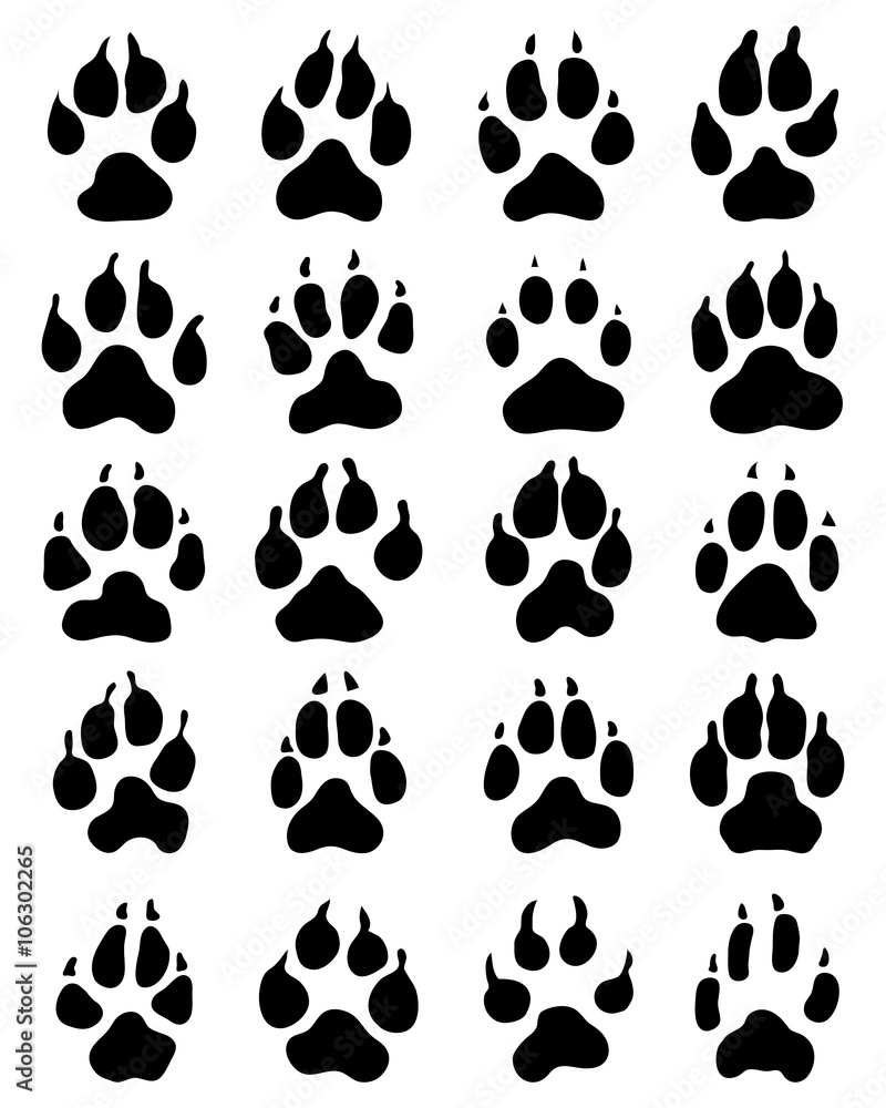 Fototapeta Black print of dogs paws on white background, vector