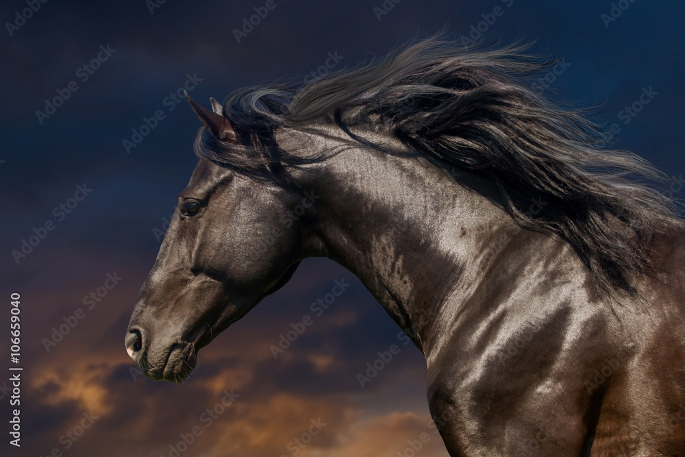 Fototapeta Black stallion in motion portrait isolated against sunset sky