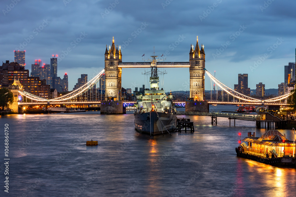 Fototapeta Tower Bridge and Belfast warship on Thames river at night, London, UK