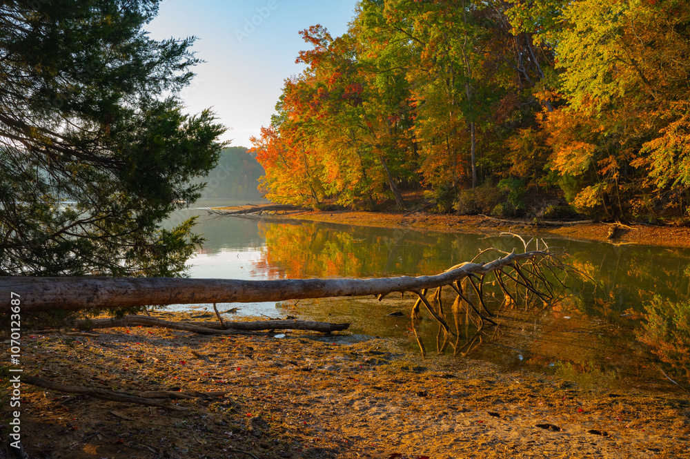 Fototapeta A beautiful autumn morning on Chickamauga Lake, with fall colors reflected in th