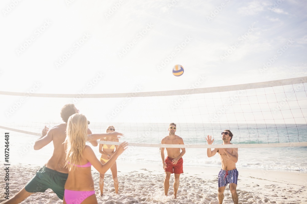 Happy friends playing beach volleyball