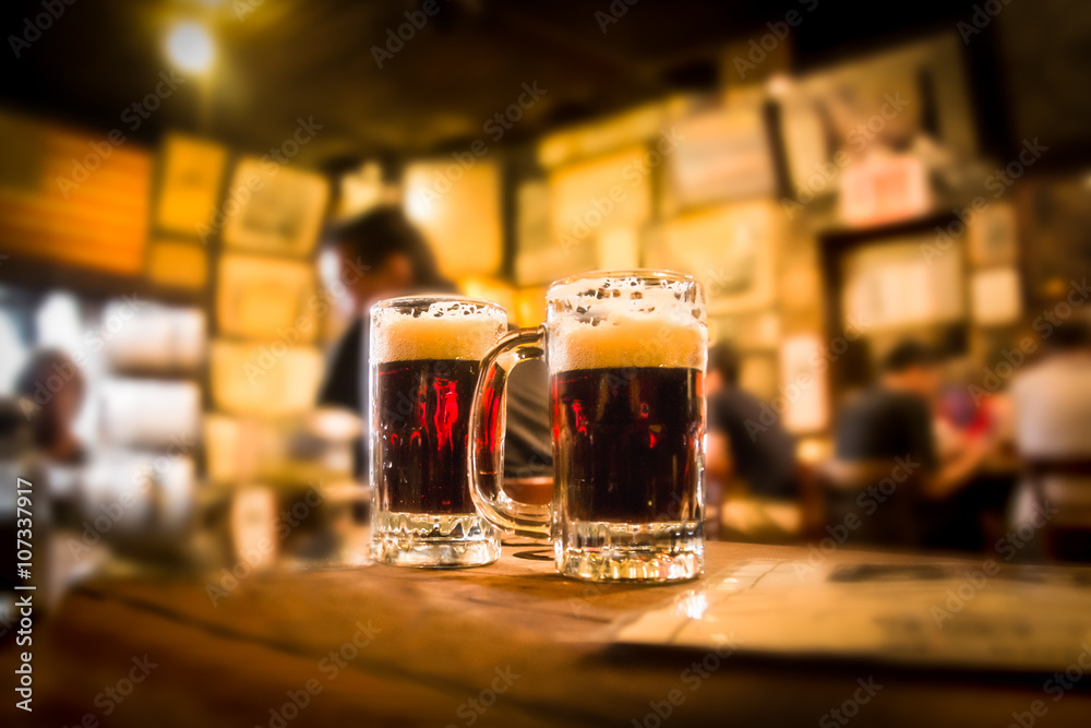 Fototapeta Defocused bar blur with 2 mugs of beer in focus