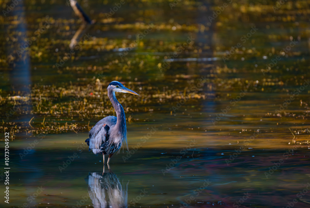 Fototapeta Great blue heron standing still in water, Chickamauga Lake, Harrison Bay State P