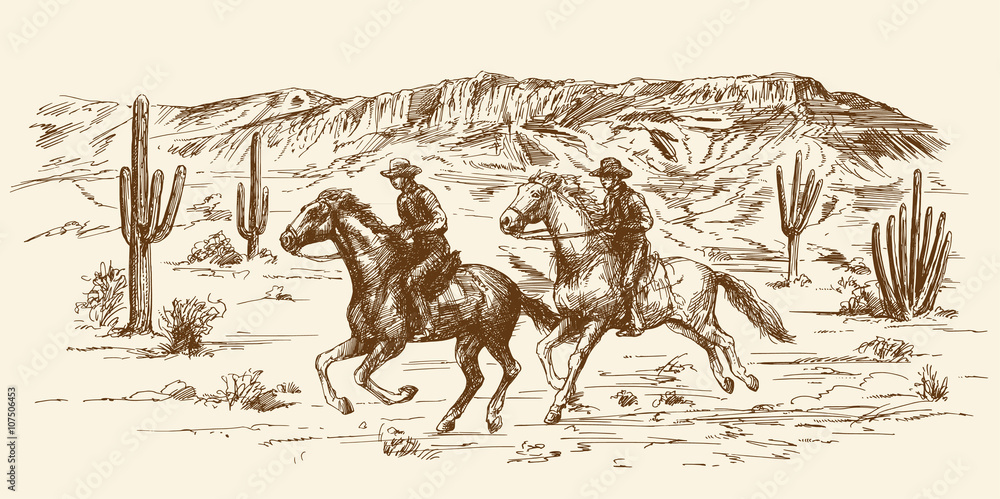 Fototapeta American wild west desert with cowboys - hand drawn illustration