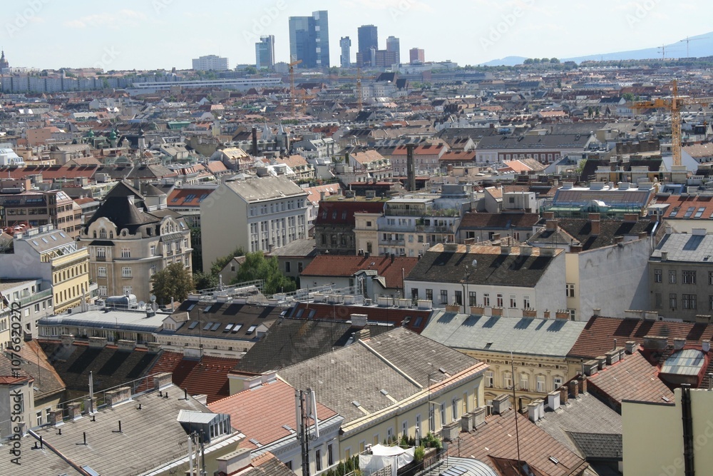 Fototapeta Panoramic view of Vienna's historic rooftops with modern skyscrapers in the back