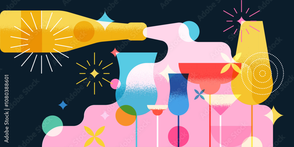 Fototapeta Night party banner, poster design with liquid champagne, bottle, cocktails, fireworks