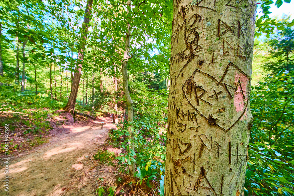 Fototapeta Love Carvings on Forest Tree Along Woodland Path in Hocking Hills Eye-Level View