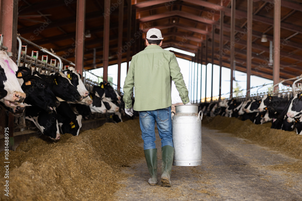 Fototapeta Rear view of farmer carrying aluminium milk churn along stalls with cows eating