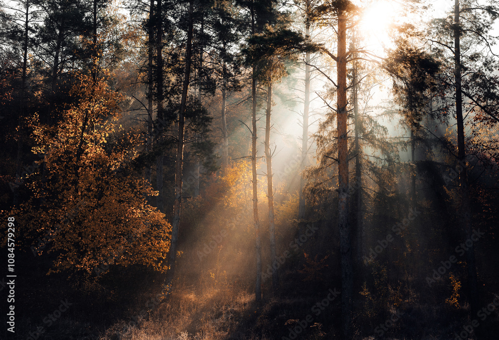 Fototapeta Dramatic shafts of golden sunlight pierce through the mist and pine trees, illuminating the forest floor and autumnal foliage in a moody scene