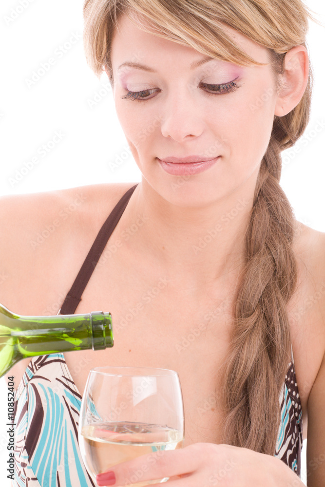 Fototapeta Portrait of lovely girl in bikini fill winglass by wine