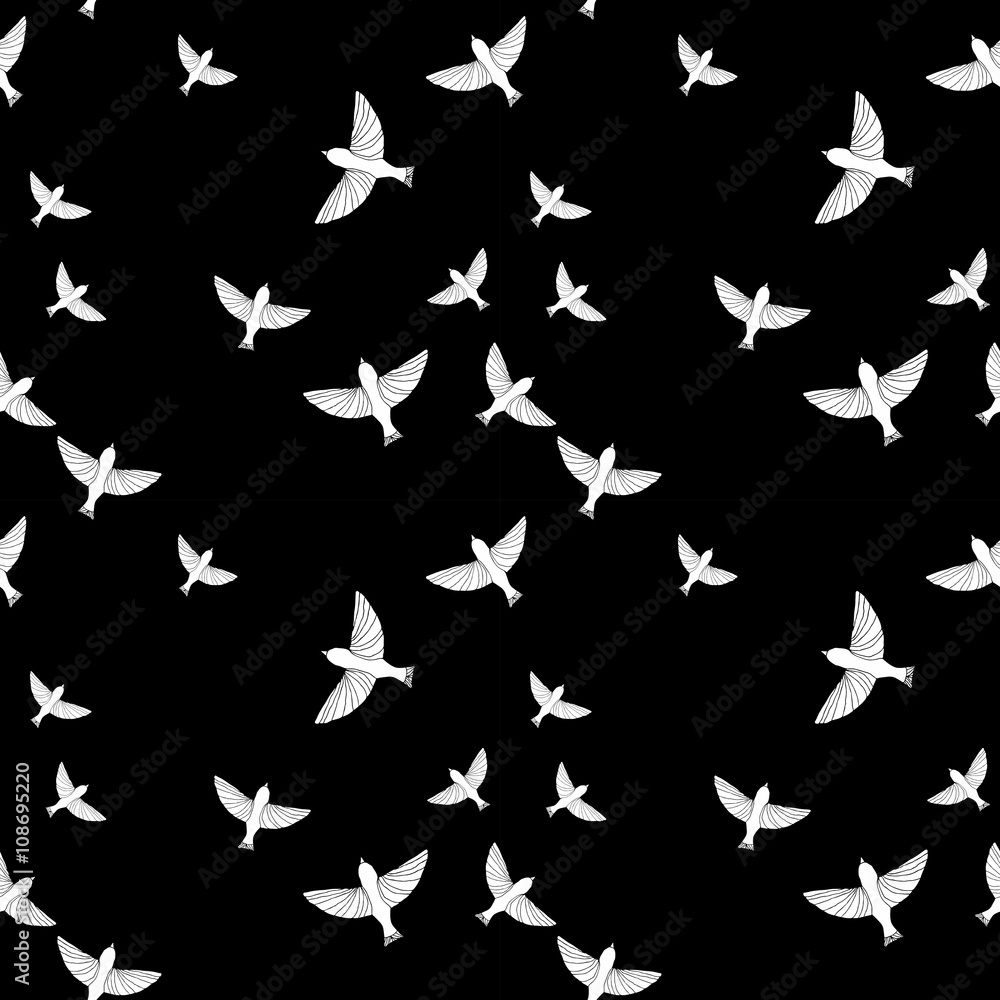 Fototapeta Seamless pattern with white birds on black background