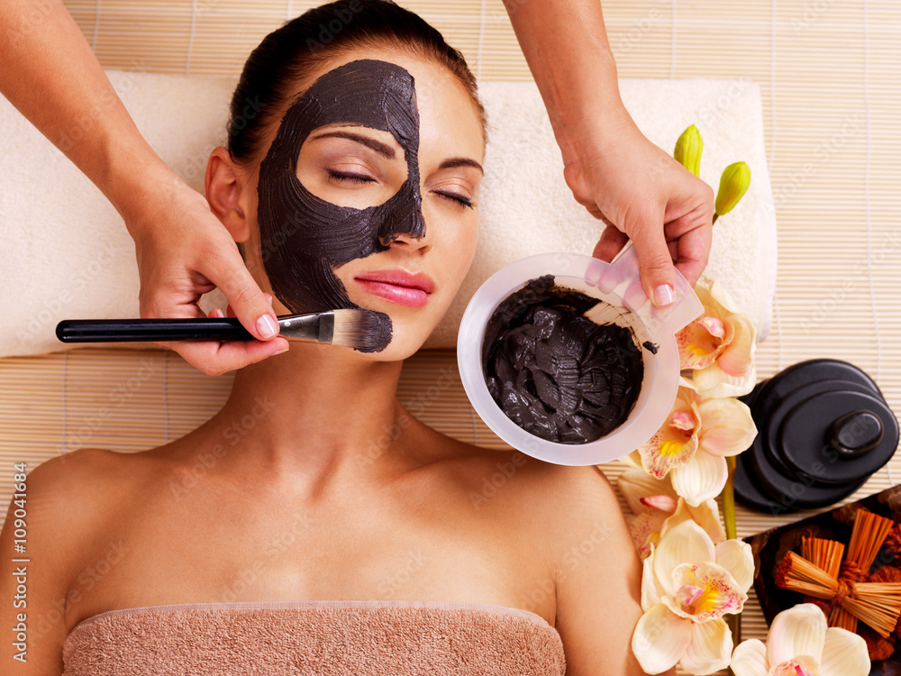 Fototapeta Cosmetologist smears cosmetic mask on the face of woman