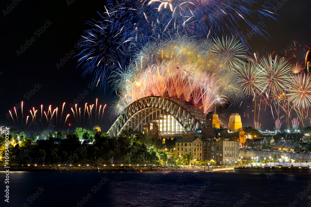 Fototapeta Sydney Harbour Bridge New Years Eve fireworks, colourful NYE fire works lighting the night skies with vivid multi colours NSW Australia