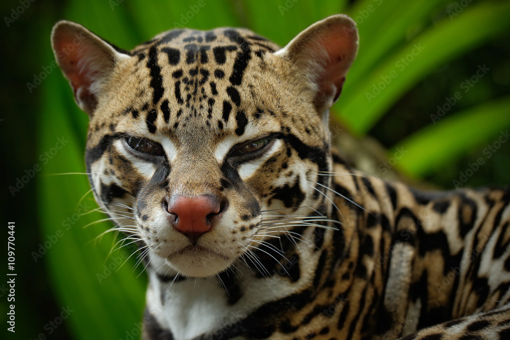 Fototapeta Detail portrait of ocelot, nice cat margay sitting on the branch in the costaric