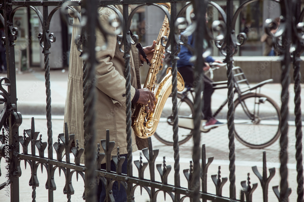 Fototapeta african street musician playing jazz on saxophone throw lattice with bicycle sil