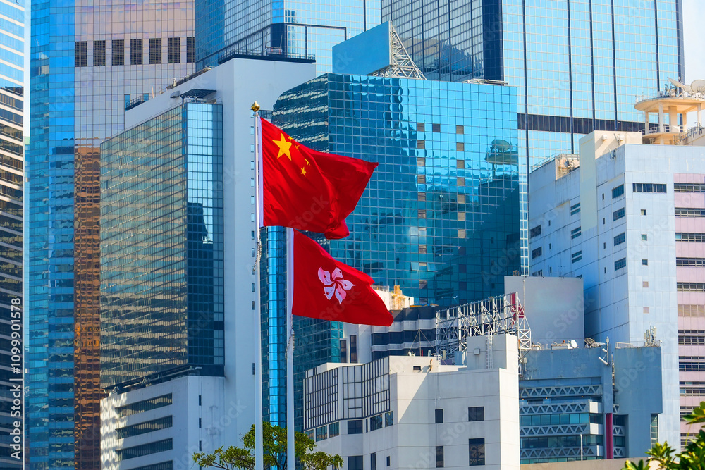 Fototapeta Flag Republic of China and Hong Kong Special Administrative region, the background of city buildings