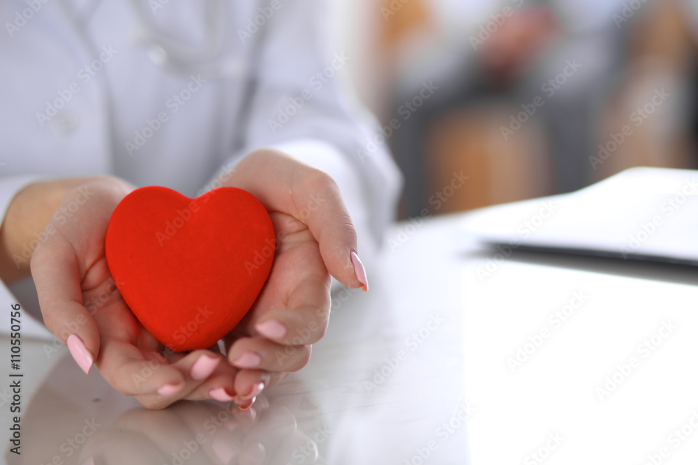 Female doctor with stethoscope holding heart. Patients couple sitting in the background