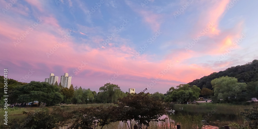 Fototapeta Beautiful landscape with a stunning Sunset, in Boramae Park, in Seoul, Korea