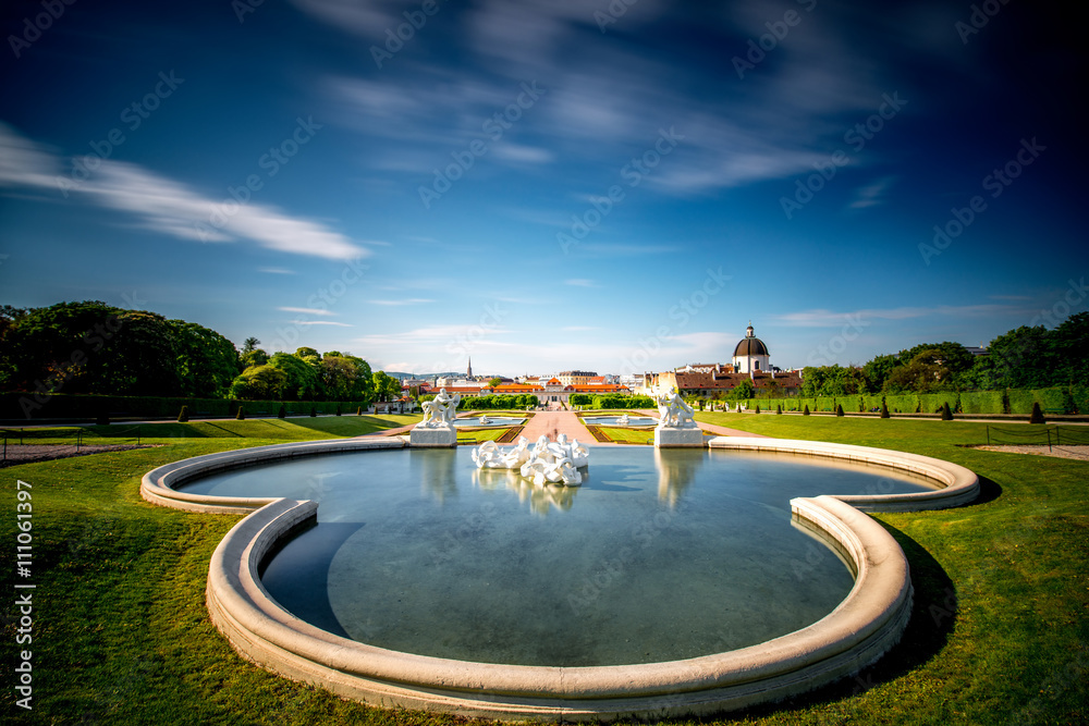 Beautiful fontain in Belvedere with lower palace and park on the background. Wide angle image with long exposure technic
