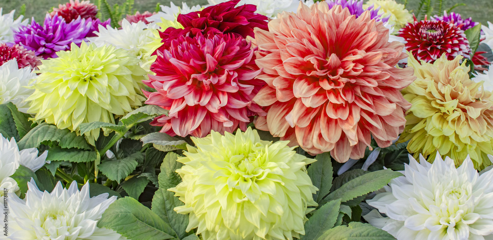Fototapeta Yellow, orange and red dahlia flowers and plants