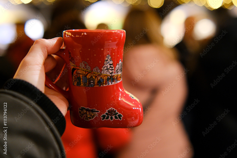 Fototapeta Human hand holding mug of mulled wine against the backdrop of a Christmas market