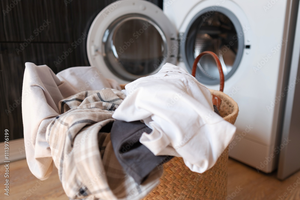 Fototapeta A laundry basket with dirty clothes lies near a washing machine, focus on detergents and gels for removing tough stains