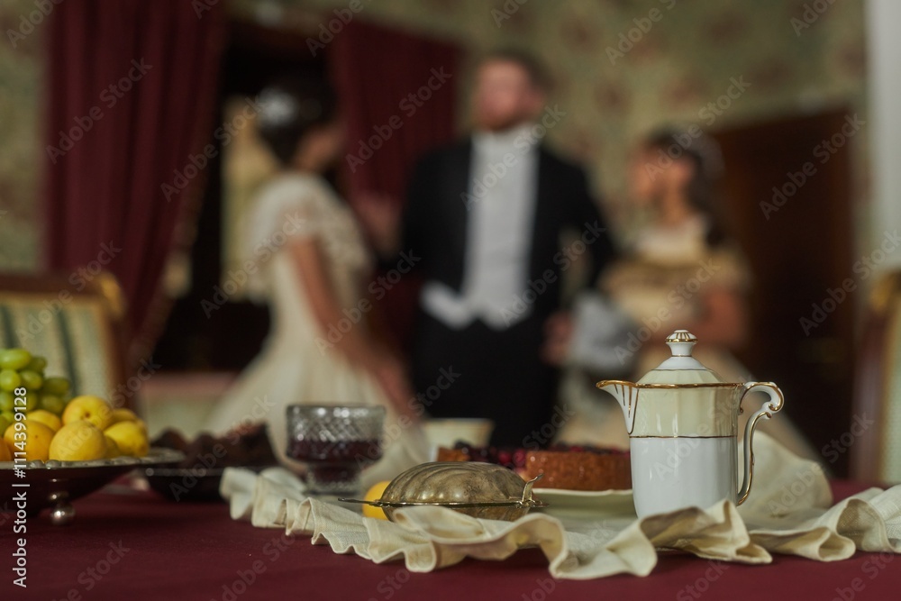 Fototapeta Close up detail shot of ornately designed porcelain creamer and plate on red vel